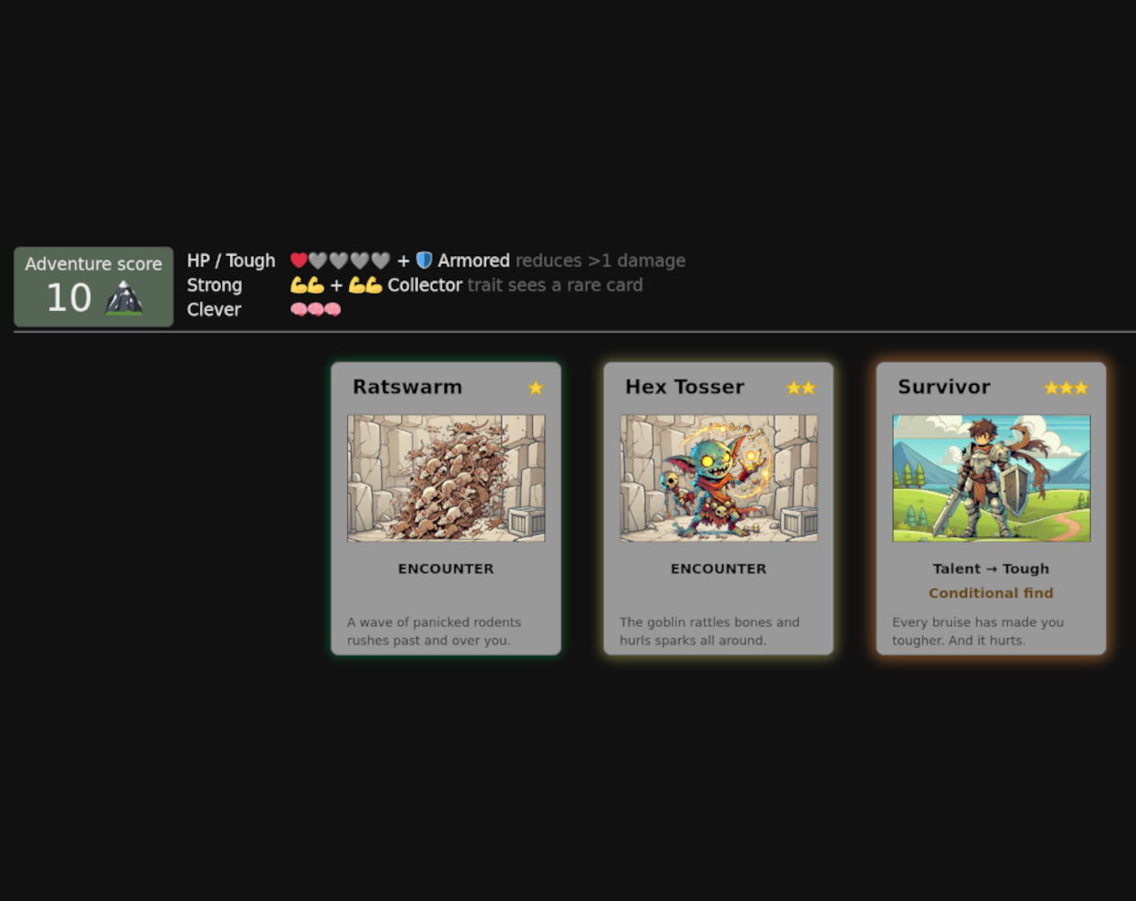 Encounters award adventure points when overcome. Success depends on your stats, but the how is intentionally vague. Many threats can be solved through either Strength or Thought, while others demand a specific of the two — hinted through the flavor text.